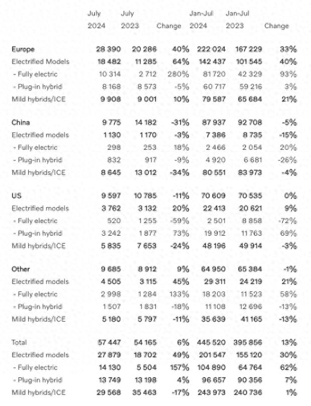 今年1-7月,沃尔沃汽车全球累计销量445,520辆,同比增长13%,新能源累计销量达到201,547辆,同比增长30%。其中,纯电动车累计销量104,890辆,同比增长62%;混动车销量96,657辆,同比增长7%。