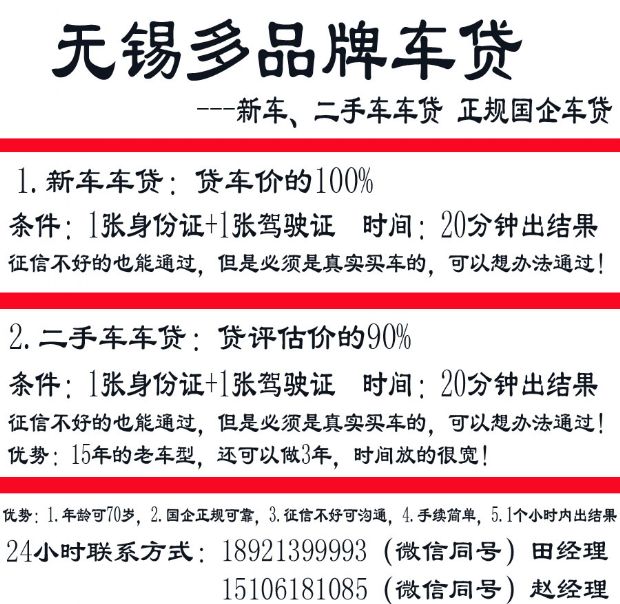 无锡多品牌车贷(新车、二手车都有)1.新车车贷:贷车价的100% 条件:1张身份证+1张驾驶证 时间:20分钟出结果 征信不好的也能通过,但是必须是真实买车的,可以想办法通过!(但必须销量在第一线判断真实购车) 2.二手车车贷:贷评估价的90%<